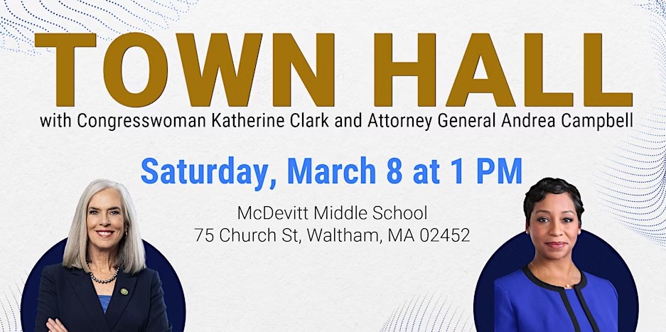 An in-person event in Waltham, MA at 1 pm Sat. Mar. 8 Democratic Whip Katherine Clark and Attorney General Andrea Campbell will be in Waltham (McDevitt Middle School) to take questions from the community. To reserve a spot click HERE