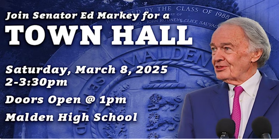Attend Markey Town Hall in Malden; 3/8 @ 2:00-3:30 pm Join us at Malden High School for a community conversation with Senator Ed Markey. Doors open @ 1 PM. Reservations (no cost) are required; see Eventbrite LINK